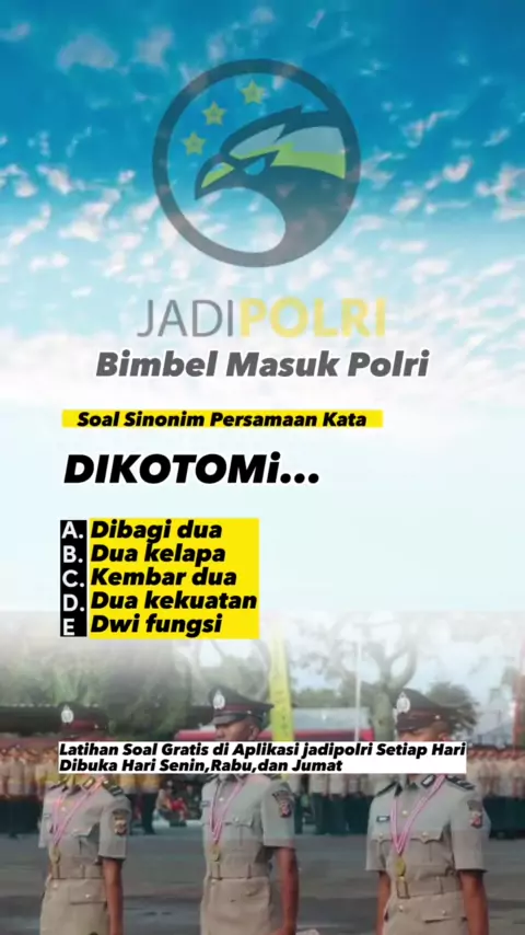 Psikotes Polri - Persamaan Kata (Sinonim) Saatnya raih impian kamu bareng Aplikasi @jadipolriofficial DOWNLOAD APLIKASI JADIPOLRI DI PLAYSTORE/APPSTORE Kami punya FORMULA agar kalian LOLOS ditahapan TES PSIKOLOGI & AKADEMIK : jadipolriofficial #psikotespolri