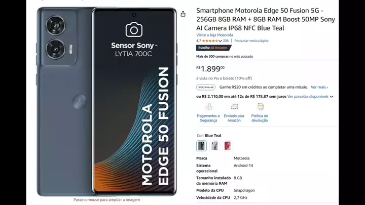 Smartphone Motorola Edge 50 Fusion 5G - 256GB 8GB RAM + 8GB RAM Boost 50MP Sony AI Camera IP68 NFC Blue Teal R$1.899,00 à vista no Pix e boleto (10% off) ou R$ 2.110,00 em até 12x de R$ 175,87 sem juros #Retrospectiva2024 #maisviews #viraliza #kwai #viral