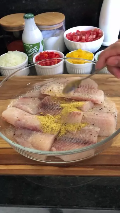 Filé de Tilápia ao molho Para preparar voce vai precisar: Filé de tilápia 800 gramas Sal a gosto 1/2 limão Pimenta do reino a gosto Lemon pepper 1/2 pimentão verde 1/2 pimentão amarelo 1/2 pimentão vermelho 1 colher de Colorau 2tomates maduros usei o italiano 1 vidro de leite de coco Coentro a gosto 1 cebola. #ReceitascomPeixes #ReceitasComTilapias #ReceitasSaborosas #ReceitasFaceis