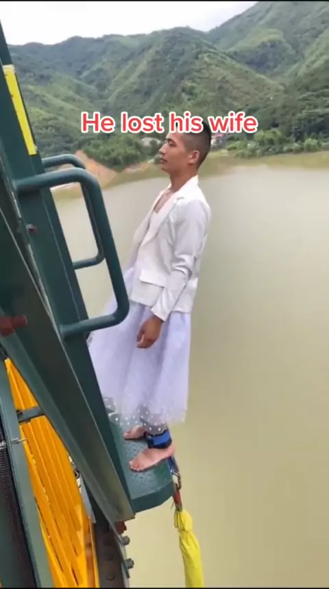 O desejo de sua esposa era pular de bungee jump, e ele colocou as roupas de sua esposa para realizar seu desejo. # # # # Love # bungeejump