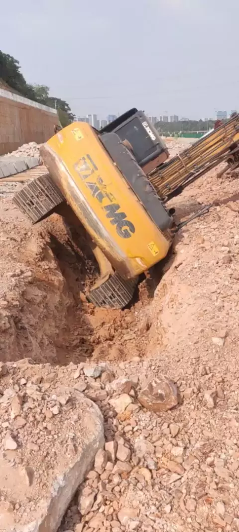 #trator draga máquina industrial obra retroescavadeira caiu no buraco esteira construção civil