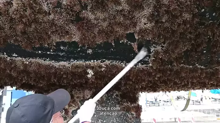 O navio estava coberto de cracas e canhões de água para limpá-lo.