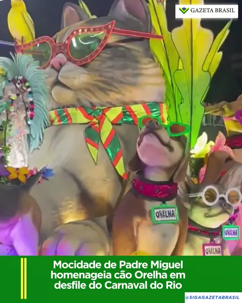 A Mocidade Independente de Padre Miguel homenageou o cão Orelha, morto por adolescentes em Florianópolis, em seu desfile do Grupo Especial do Carnaval do Rio nesta segunda-feira (16). A homenagem fez parte do enredo que celebra Rita Lee, conhecida por seu amor pelos animais, e contou com esculturas de pelo menos oito animais usando óculos coloridos e coleiras com o nome de Orelha.