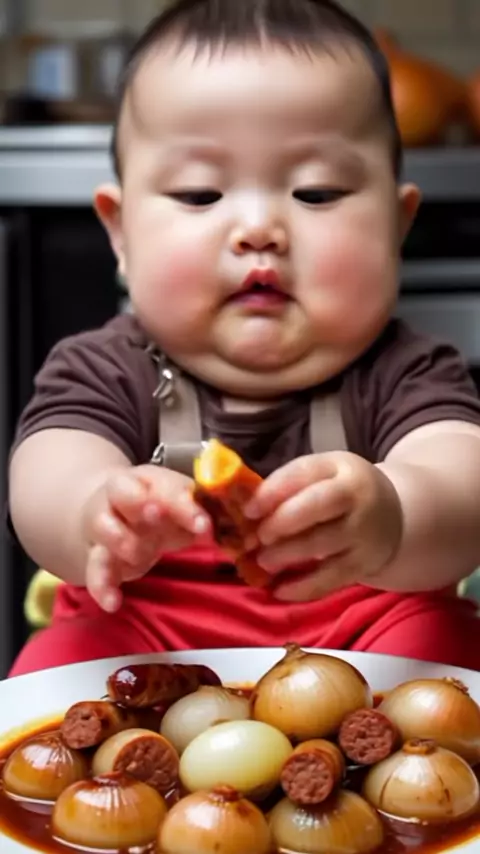 Bayi Tiongkok yang sehat dan menggemaskan sedang makan hidangan pedas. #KontenSnackAI