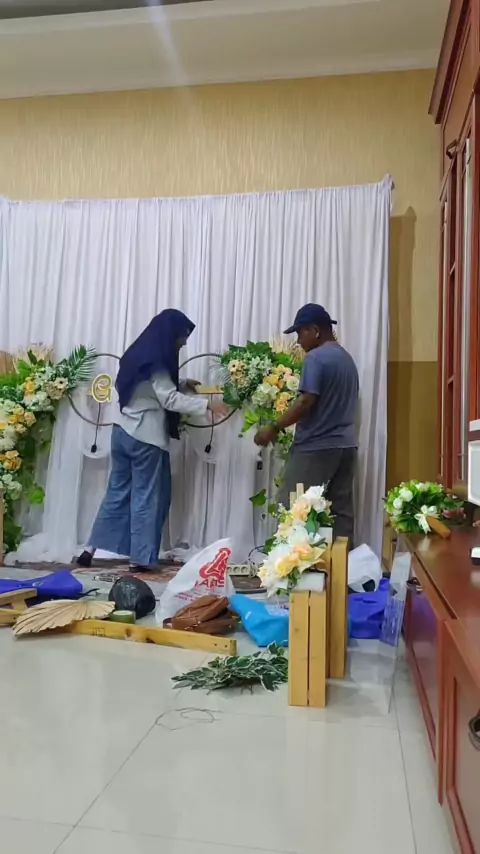 Pasang dekor sama bapak ☺️, andai ndekor secepet ini prosesnya 😆 # #dekorlamaran #dekorasilamaran #engagementday#engagement #backdropsolo #dekorasilamaransolo
