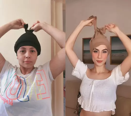 A touca para dormir é um jeitinho bem simples e eficaz de manter as madeixas lisas, sem frizz e sem volume. Elas podem ser feitas com meia calça ou compradas com tecido de algodão. Não fico sem minha touca kkkkk #cabelos #semfrizz #me #AsMinasTaon #DesafioMeiaNoite