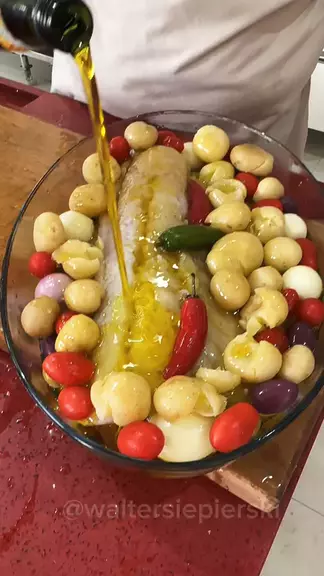 BACALHAU NO BAFO DO WALTER SIEPIERSKI 🌽 Ingredientes: Bacalhau Batata Palmito Cebola Tomate cereja Azeitonas Pimenta jalapeno Azeite Alho . . #waltersiepierski #bacalhau #almoço #peixe #receitadepascoa