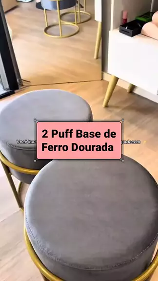 Puff Iron Base Ferro Argola Dourada Metalizada Suede Bege #puff #casaedecoracao