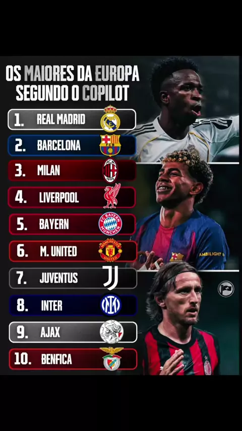 🌍 OS MAIORES DA EUROPA SEGUNDO O COPILOT 👀🔥 1️⃣ Real Madrid 2️⃣ Barcelona 3️⃣ Milan 4️⃣ Liverpool 5️⃣ Bayern 6️⃣ Manchester United 7️⃣ Juventus 8️⃣ Inter 9️⃣ Ajax 🔟 Benfica Concorda ou já começou a discordar no Top 3? 😅 Quem tá muito alto? Quem ficou muito baixo? Quem merecia estar na lista? Debate liberado 👇🔥 #FutebolEuropeu #ChampionsLeague #RealMadrid #Barcelona #Milan