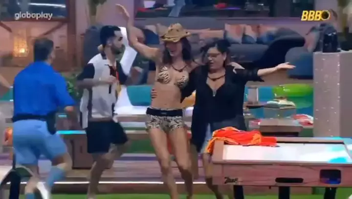 Legenda: Pool Party liberada! 🎉 Festa do TOP 7 é mais íntima, mais social, né? E a gente já sabe que Gui e Del vão curtir até o último segundo. Inimigos do fim que fala, né? 🤣 📲 Segue nossa dupla pra acompanhar tudo! 📸 Reprodução: TV Globo #DELMAeGUI no #BBB25 | 🍺🦀