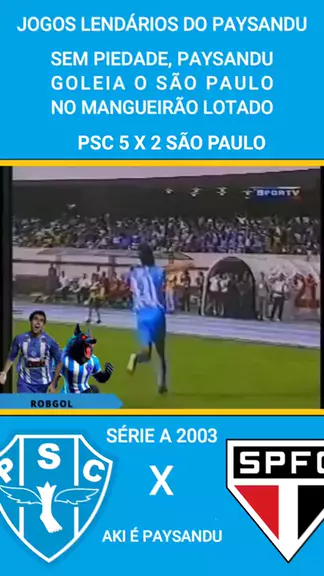 JOGOS LENDÁRIOS DO PAYSANDU Paysandu em dia inspirado não tomou tomou conhecimento, goleou (por 5 x 2) o São Paulo (com Luis Fabiano, Júlio Batista, Rogério Ceni,etc), com Had-trick do artilheiro Robgol, Lecheva e Iarley em um mangueirão lotado, para festa da torcida Bicolor. #Paysandu #papaodacuruzu #Futebol #saopaulofc #SERIEA⚽