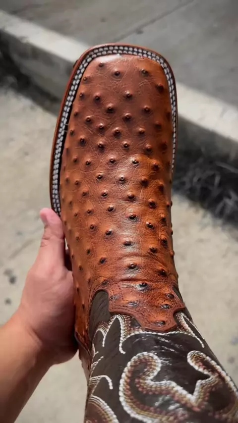 Men’s Cognac Ostrich Square Toe Boots On Sale For $79.99!! Sizes 8.5-13!!#alfawesternwear#alfawesternwearboots#texas#botas#westernwear#boots#botasvaqueras#cowboyboots#cowboyoutfit#ostrichboots