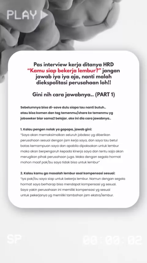 cara jawab pertanyaan HRD "kamu siap lembur?" pas sesi tanya jawab di interview kerja, hmm gimana sih yips cara jawab pertanyaan gini di interview kerja?#tipsinterviewkerja#tipswawancarakerja#interviewhr#interviewhrd#wawancarahrd#interviewkerja#wawancarakerja#tipshrd#freshgraduate#tipsfreshgraduate#tipsketerimakerja#diterimakerja#keterimakerja#hrdindonesia#lolosinterview#strategilolosinterview#tipslolosinterview#caralolosinterview#tipsketerimakerja#lolosinterviewkerja#interviewfreshgraduate#jag...