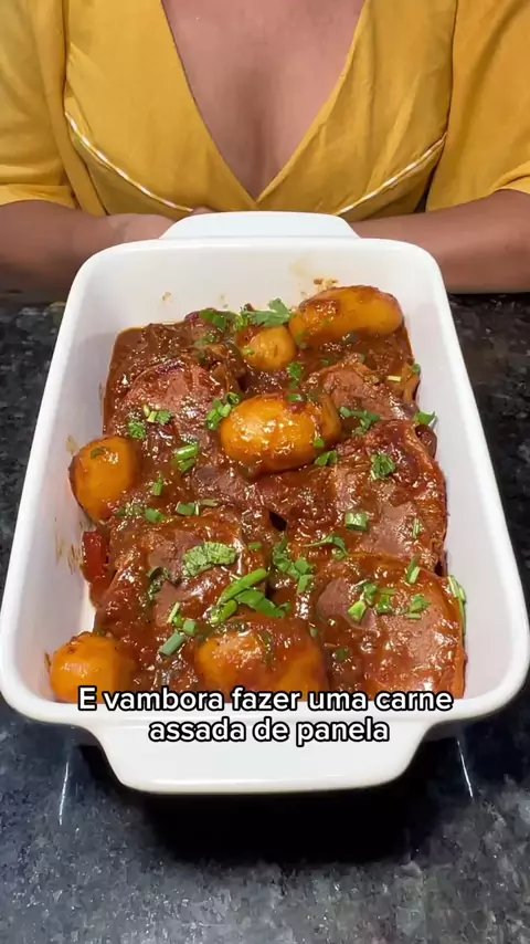 👩🍳 Receita Carne Assada de Panela. Ingredientes: 1 kg de lagarto (ou coxão duro) 2 pimentas de cheiro 1 pimentão 1 folhas de louro 1 cebola grande 5 dentes de alho 1 maço de cheiro verde 7 batatas pequenas Azeite 1 Tomate Sal a gosto Pimenta do reino a gosto Colorau a gosto Páprica a gosto 2 colheres de molho inglês.