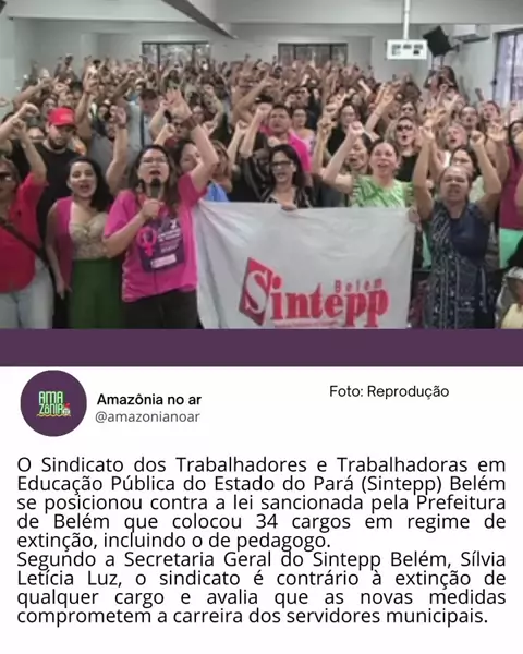O Sintepp Belém se manifestou contra a lei sancionada pela Prefeitura que colocou 34 cargos em regime de extinção, incluindo o de pedagogo. Segundo a entidade, as medidas comprometem a carreira dos servidores e deixam trabalhadores vulneráveis. A lei não prevê demissões, mas determina que os cargos não terão reposição futura e deixarão de existir gradualmente na estrutura municipal. #AmazôniaNoAr