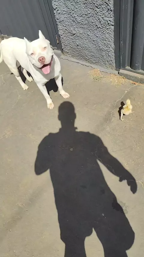 cachorro e pintinho na rua #saddampitbull #pintinho #dogs #cao #MeuPet