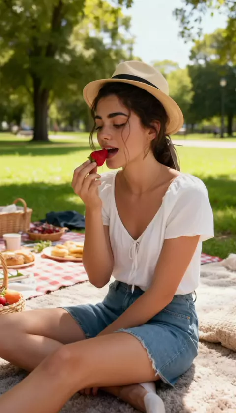 I came to this picnic to enjoy some strawberries, but I have a feeling I'm the sweetest snack here. Do you agree?
