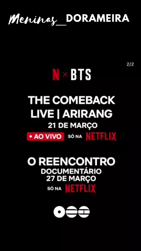 BTS NA NETFLIX, THE COMEBACK AO VIVO | ARIRANG 21 de marco às 20h KST 4h PST O BTS vai se apresentar na histórica Praça Gwanghwamun em Seul. AO VIVO mnundialmente exclusivamente na Netflix 3TS: O RETURN. FILME DOCUMENTÁRIO 27 de março BTS: O RETURN, um documentário mostrando o making of do seu álbum de retorno ARIRANG. Só na Netflix RETORNO DO BTS AO VIVO: ARIRANG Comeback do BTS ao vivo na Praça Gwanghwamun, 21 de marco às 20h, ao viva exclusivo Netflix mundialmente.Fonte BigHit e Netflix