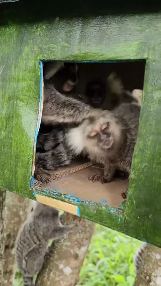 Os macacos saguis passado a chuva na casa.