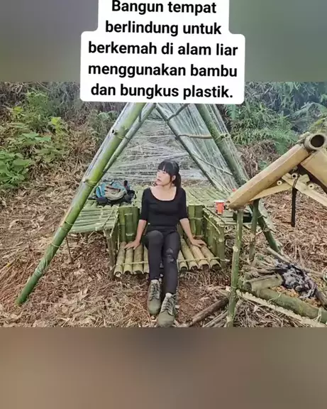Bangun tempat berlindung untuk berkemah di alam liar menggunakan bambu dan bungkus plastik. #BERKEMAH #camp #hutan