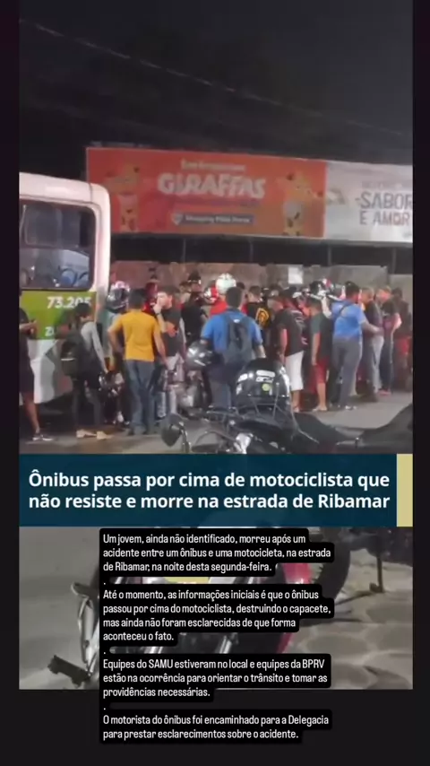 Não resistiu! . Um jovem, ainda não identificado, morreu após um acidente entre um ônibus e uma motocicleta, na estrada de Ribamar, na noite desta segunda-feira. . Até o momento, as informações iniciais é que o ônibus passou por cima do motociclista, destruindo o capacete, mas ainda não foram esclarecidas de que forma aconteceu o fato. . Equipes do SAMU estiveram no local e equipes da BPRV estão na ocorrência para orientar o trânsito e tomar as providências necessárias. #maisviews #saoluis