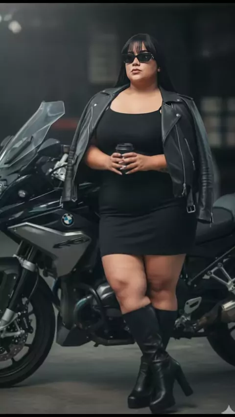 #novatrend#fotogemini#rayp#fotogria#plus cole e copia o texto abaixo ๐๐ป๐๐ป @Billa Borges ๐ธDecembr:AI GEMINI PLUS SIZE VERSION! PROMPT: Create image of a oversize woman wearing black highwaist short skirt, black tube, black leather jacket, black mid length leather boots with thick high heels, wear sunglasses, sit standing on the side of the black BMW big bike, legs crossed, with a mysterious look beside the black BMW motorcycle but the face should be similar, and hands holding a black cup o...