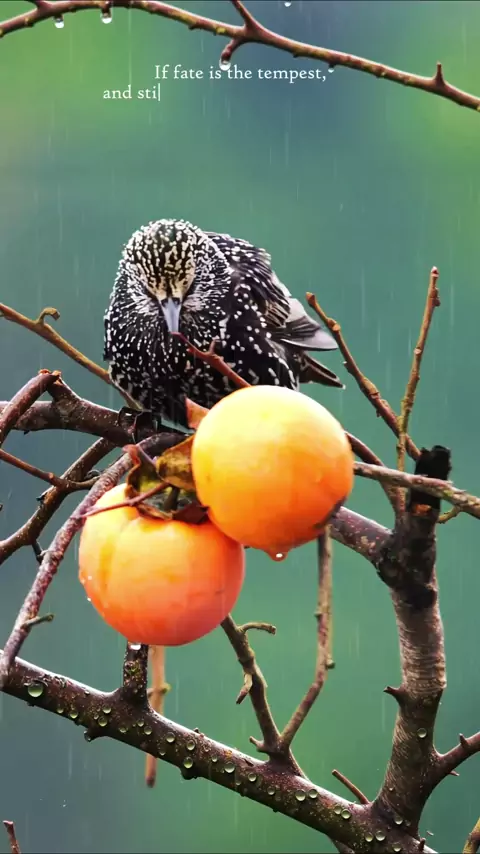 It pecks at the fruit with such focus, utterly immersed in the present moment's downpour. The European Starling (Sturnus vulgaris) is a medium-sized, highly adaptable songbird native to Europe, Asia, and North Africa. Glossy black plumage with iridescent purple and green hues in sunlight; ~20 cm (8 in) long, with a short tail and pointed wings. #europeanstarling #bird #didyouknow