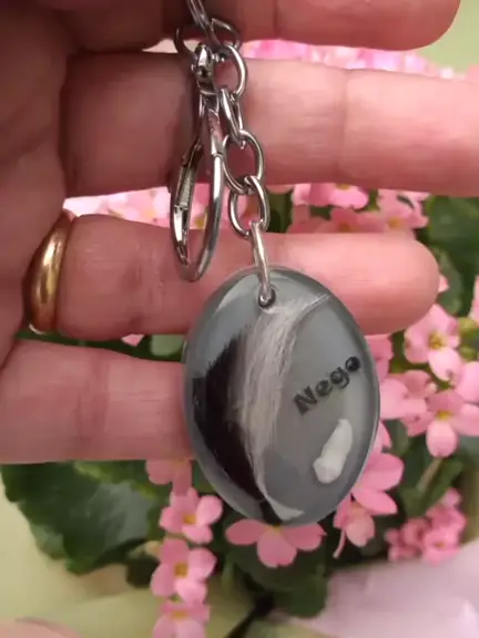 Pelo,dente e a foto do Nego eternizado em um pingente para chaveiro. #maedepet #joiacomdente #joiacompelopet #pingentepersonalizado.