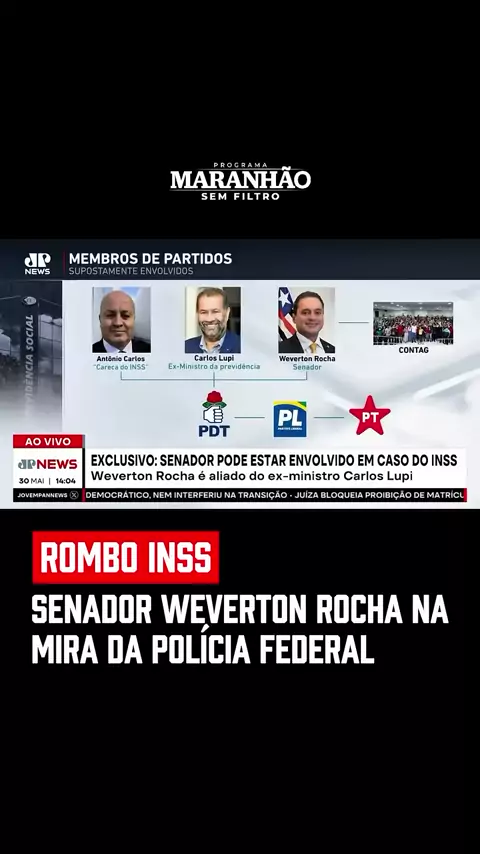 🚨 Senador Weverton Rocha na mira da Polícia Federal O senador maranhense Weverton Rocha (PDT) está no centro de uma tempestade política e jurídica. Ele é apontado como um dos principais suspeitos no esquema bilionário de desvio de recursos do INSS, atualmente sob investigação pela Polícia Federal. Aliado histórico do ex-ministro Carlos Lupi, do governo Lula, Weverton deverá prestar depoimento nos próximos dias. A investigação, que já mobiliza os bastidores de Brasília.