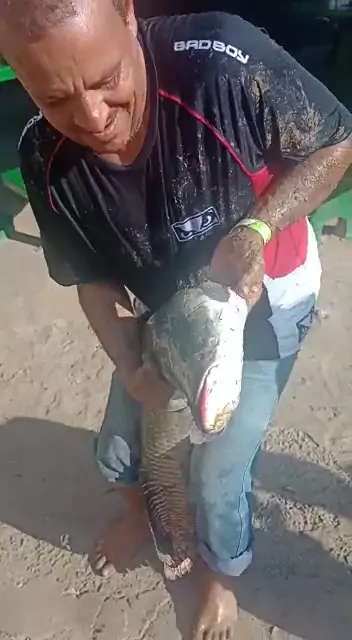 SÓ NO PESQUEIRO RECANTO FÁVARO PARA PEGAR UM PIRARUCU NA DIÁRIA APENAS R$ 70 E LEVA UM PEIXE BRUTO DESSE.