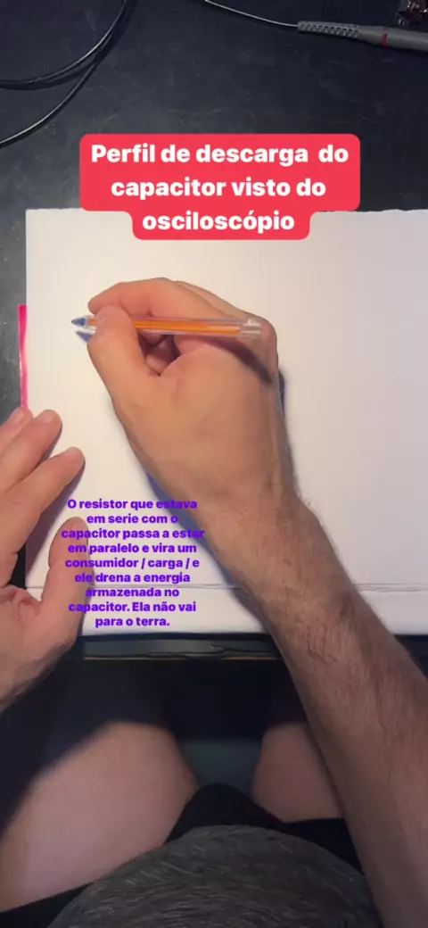 Perfil de descarga do capacitor eletrolítico em corrente contínua. Uma vez que a chave muda da posição 1 , inicial, onde o resistor está em série com o capacitor e vai para posição 2 , o resistor passa a estar em paralelo com o capacitor , o que faz fechar um circuito , curto circuitando o capacitor e descarregando suas cargas em cima do resistor que a converte em calor. Nada se perde para o terra. #Eletronica