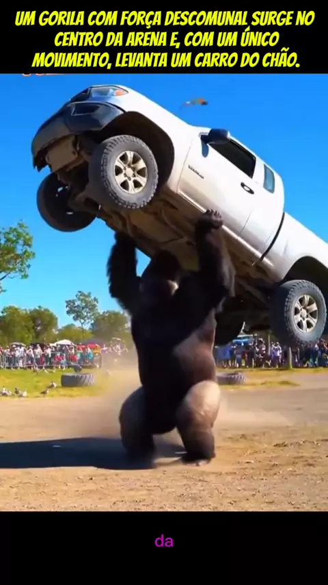Um gorila com força descomunal surge no centro da arena e, com um único movimento, levanta um carro do chão. A plateia explode em aplausos e gritos #educação #foryou #ia #viraliza #vidaanimal