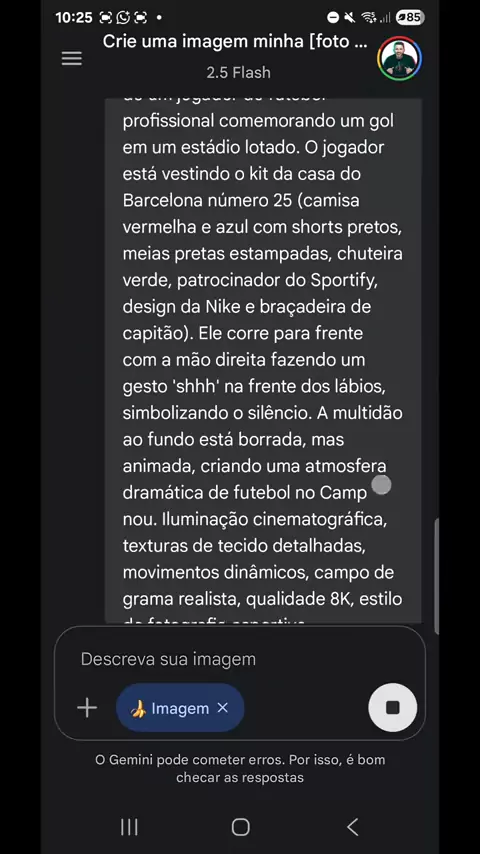 mais um prompt para você transformar sua foto em uma imagem incrível usando o nanobanana do gemini do Google gratuitamente. PROMPT 🚨 Crie uma imagem minha [foto enviada em anexo] ultra-realista de um jogador de futebol profissional comemorando um gol em um estádio lotado. O jogador está vestindo o kit da casa do Barcelona número 25 (camisa vermelha e azul com shorts pretos, meias pretas estampadas, chuteira verde, patrocinador do Sportify, design da Nike e braçadeira de capitão). Ele corre pa...
