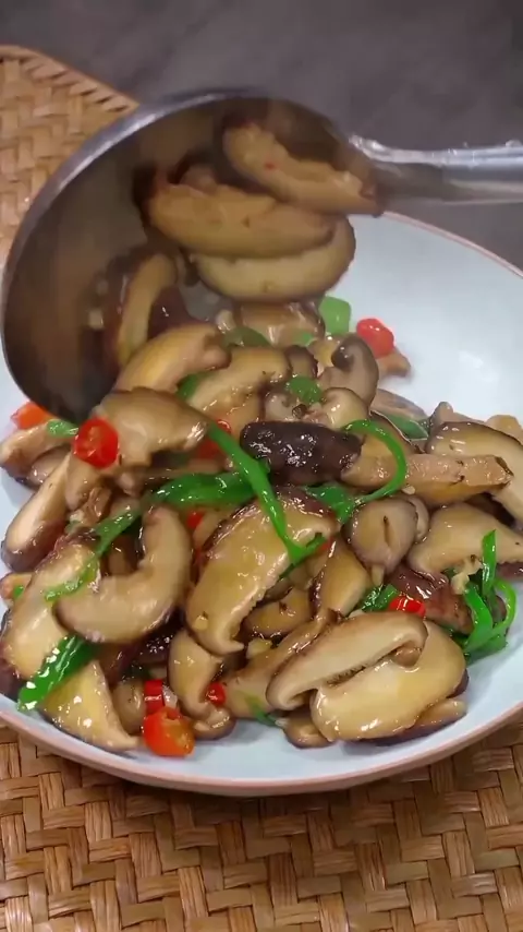 Hoje estamos fazendo um prato simples de cogumelos shiitake fritos. Vamos aprender como fazer juntos. Primeiro, corte os cogumelos shiitake em fatias grossas. Corte o pimentão picante em tiras finas. Ferva a água e adicione os cogumelos. Cozinhe até ficarem macios, escorra e coloque de lado. Aqueça o óleo, adicione o alho picado e a pimenta picada. Frite até ficar perfumado. Adicione os cogumelos e frite algumas vezes. Adicione sal, caldo de frango, molho de soja leve e molho de ostra para tempe