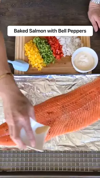 Baked Salmon with bell peppers and mayonnaise recipe. This is an easy recipe that’s different from the typical baked salmon. Full of flavor from the mayonnaise and bell peppers. Try it! #food #foodie #Kwaifood #Kwairecipe #salmon
