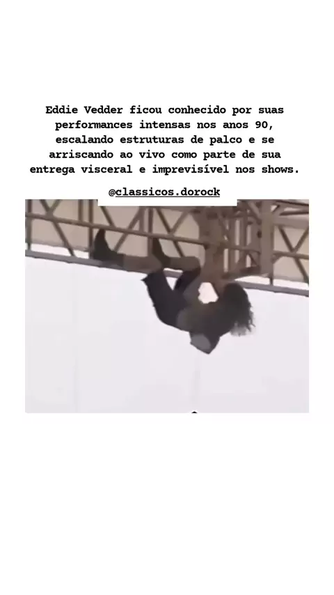 Em 20 de setembro de 1992, Eddie Vedder surpreendeu o público ao subir sem cinto de segurança na estrutura do palco para desenroscar um microfone preso, mostrando a ousadia e energia que marcaram os primeiros anos do Pearl Jam. #pearjam #eddievedder #grunge #grungeanos90 #naçãoroqueira