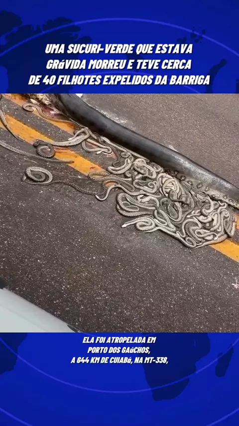 Uma sucuri-verde (Eunectes murinus) que estava grávida morreu e teve cerca de 40 filhotes expelidos da barriga ao ser atropelada em Porto dos Gaúchos, a 644 km de Cuiabá, na MT-338, #noticias