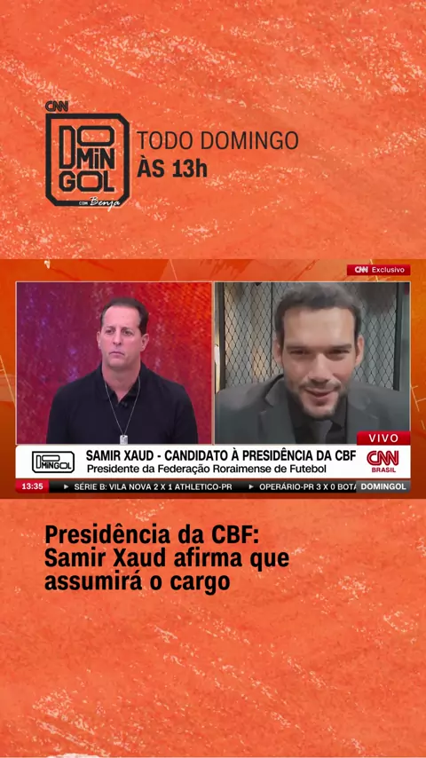 NOVO MANDATÁRIO Em entrevista ao #DomingolcomBenja, Samir Xaud confirmou que será o novo presidente da CBF. Neste domingo (18), o atual presidente da Federação Roraimense de Futebol fez o primeiro pronunciamento para uma emissora de TV, e admitiu que vai substituir Ednaldo Rodrigues no principal cargo da entidade que administra o futebol brasileiro. #CNNEsportes #CNNBrasil #CNNAoVivo #CBF
