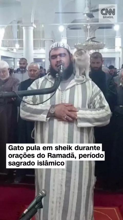 Gato pula em sheik durante oração do Ramadã, em mesquita na Argélia, e “escala” até receber colo e carinho #CNNBrasil #KwaiNotícias #Ramadã #Gato