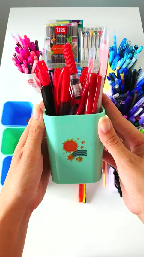 Minha mesa tava uma bagunça! Bora organizar as canetas, porque eu amo! #canetas #materialescolar