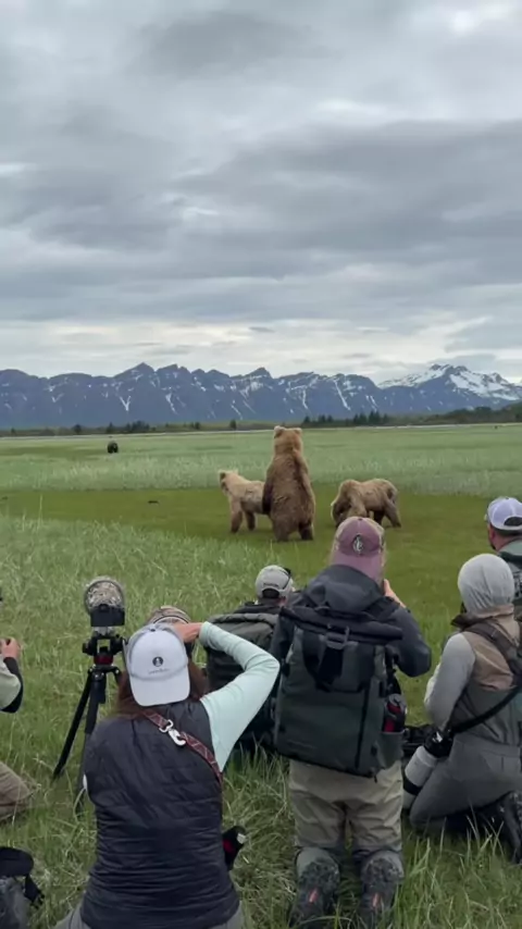 Mother bear gets nervous about big Boar and stands up to check him out. 🐻 Notice how these bears arent even looking in our direction? They are used to us in this environment and at ease around us. (I am a professional bear guide, never approach or go near bears in the wild)#bearguide#brownbear#grizzlybear#wildlifeencounters