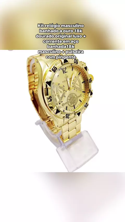 Kit rel贸gio masculino banhado a ouro 18k dourado original luxo + corrente em a莽o banhada18k masculino + pulseira com pingente