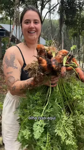 pra quem riu da minha cenoura pq ela era pequena, agora vai rir pq ela é estranha 😅 tão bom colher as coisinhas da hortaaaa 🥹♥️ #horta #colheita #natureza #plantas #cenoura