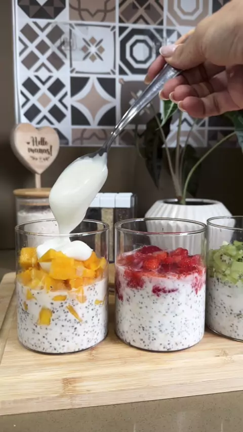 OVERNIGTH 1/3 de xícara de aveia em flocos 1cs de chia Iogurte natural Frutas Mel