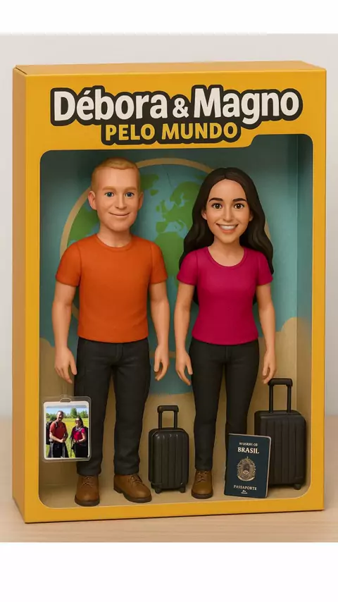 👇Aprenda como fazer o seu boneco viajante: 📌Abra o ChatGPT, coloque uma foto sua com o seguinte prompt adequando para as suas características: Crie um casal de bonecos colecionáveis inspirados na imagem anexada, de corpo inteiro, de uma mulher morena de cabelos longos e ondulados e um homem loiro de cabelo curto e roupa exatamente como na foto. Os acessórios ao lado devem ser um crachá com a foto deles, uma mala de viagens e dois passaportes. No topo da caixa, deve estar escrito seu nome
