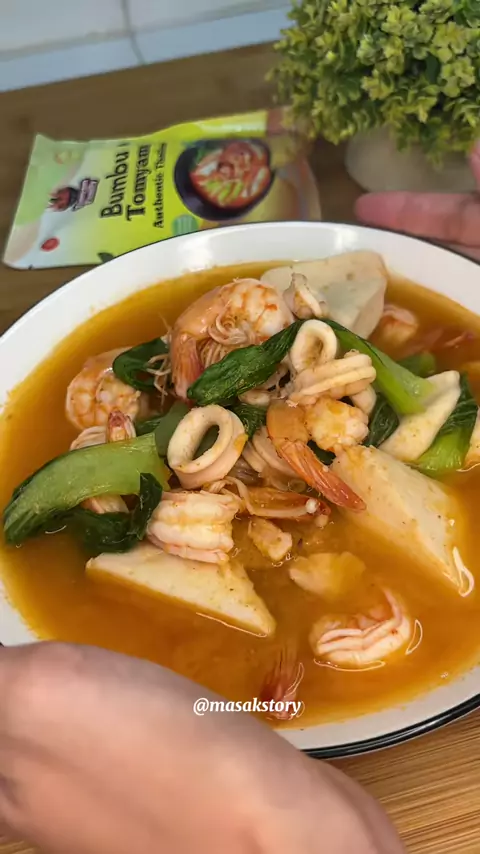 Kayak sayang banget,beli udang mahal-mahalkepalanya di buang😌 Tomyam seafood Kuah kaldu: -Kepala udang -Air 500ml Bumbu Tomyam Aku pakai @Bumbu Tomyam Family -Bumbu masak praktis -Halal sudah bersertifikat Kalian bisa dapatkan produknya di eccomerce kesayangan kalian iya,buruan cobain😍 Nah untuk kondimen Tomyamnya aku pakai: -10 udang ukuran sedang -3 cumi uluran kecil -Tahu bakso udang 5 biji -jamur enoki -Pokcoy -1 batang sereh -2 lembar daun bawang -5 sendok makan susu fuul cream Selamat...