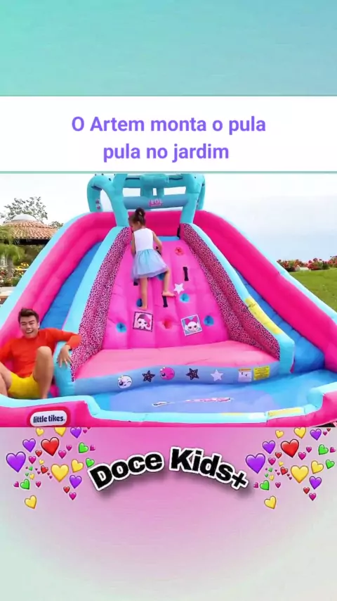 Artem monta o pula pula no jardim