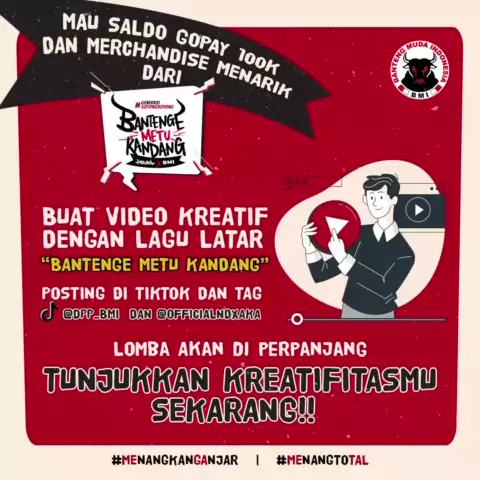 Hi Bung & Jeng kami informasikan untuk lomba video kreatif dengan lagu latar "Bantenge Metu Kandang" di perpanjang ya!! So, kalian yang masih ragu sama kreativitas kalian, masih punya waktu nih buat ngulik lagi!! Tunjukkan kreativitas terbaikmu yaaa #PDIPerjuangan #BantengMudaIndonesia #MudaBerjuang #MEnangkanGAnjar #GanjarforPresident