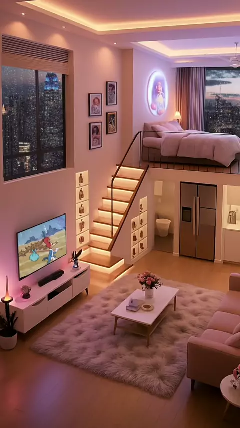 Step into this dreamy loft apartment! ✨ A cozy living space with a stunning city view, a comfy loft bed, and the most relaxing ambient lighting. Is this your dream home? Let me know your favorite detail in the comments below! 👇 #loftapartment #interiordesign #homedecor #dreamroom #cozy Entre neste apartamento loft dos sonhos! ✨ Um espaço super aconchegante com uma vista incrível da cidade