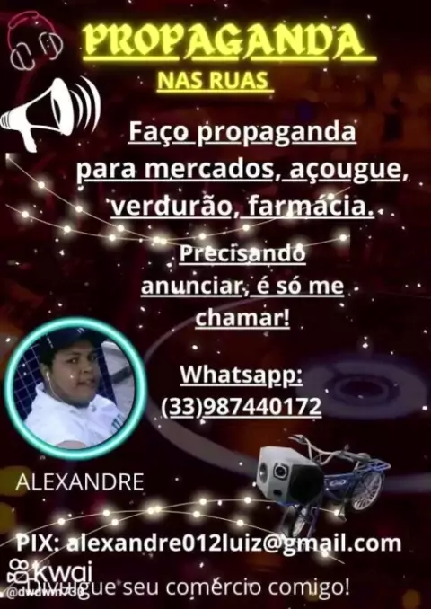 Alexandre propaganda agradece seu contato. Como podemos ajudar? SE VOCÊ TIVER SUA VINHETA 20 REAIS.CASO VOCÊ QUEIRA GRAVAR COM A GENTE 50 REAIS A GRAVAÇÃO+ 1 HORA DE PROPAGANDA!